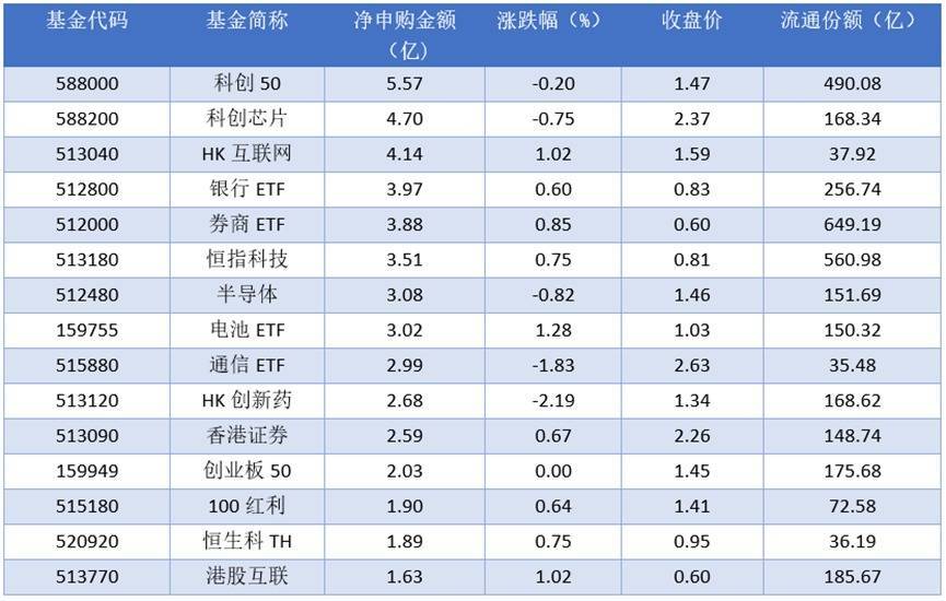 细分到资金流动情况上来看,2025年10月23日净申购金额最大的为科创50 (588000),当日净申购金额为5.57亿元。排名靠前的科创芯片(588200)、HK互联网(513040)、银行ETF (512800),申购金额为4.70亿元、4.14亿元、3.97亿元。