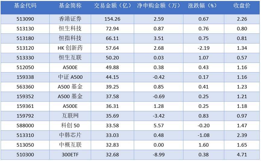 从成交金额上来看,2025年10月23日成交额最大的是香港证券(513090),交易金额154.26亿元。排名靠前的恒生科技(513130)、恒指科技(513180)、HK创新药(513120),成交额分别为72.94亿元、66.11亿元、57.64亿元。