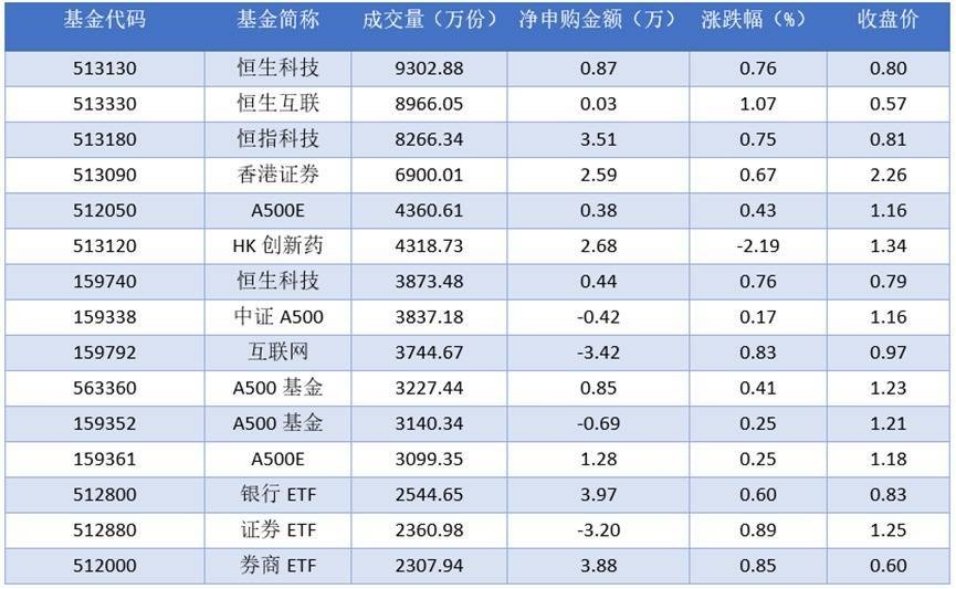 从成交量上来看,2025年10月23日成交量最大的是恒生科技(513130),成交量为9302.88万份。排名靠前的恒生互联(513330)、恒指科技(513180)、香港证券(513090),成交量分别为8966.05万份、8266.34万份、6900.01万份。