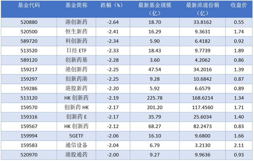 下跌方面,2025年10月23日跌幅最大的是港创新药(520880),跌幅达到2.64%。排名靠前的恒生新药(520500)、科创新药(589720)、日经ETF(513520),跌幅分别为2.41%、2.34%、2.33%。