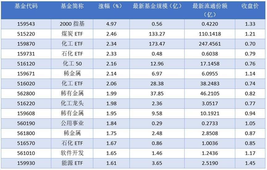 根据巨灵财经统计的数据显示,2025年10月23日场内ETF基金中2000指基(159543)领涨,涨幅为4.97%,排名靠前的煤炭ETF(515220)、化工ETF(159870)、石化ETF(159731),涨幅分别为2.46%、2.34%、2.33%。