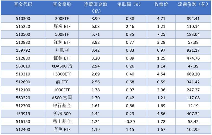 资金流出方面,2025年10月23日净赎回金额最多的是300ETF (510300),赎回金额8.99亿元。排名靠前的煤炭ETF (515220)、500ETF (510500)、红利ETF (510880),赎回金额分别为6.03亿元、5.71亿元、3.92亿元。